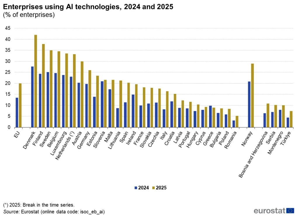 Podľa údajov Eurostatu v roku 2025 využívalo AI technológie 20 % podnikov v EÚ s aspoň 10 zamestnancami (oproti 13,5 % v roku 2024). Najvyšší podiel mali severské inovatívne krajiny ako Dánsko, Fínsko a Švédsko – blížiace sa k 40 % firiem. (Obr. 4)