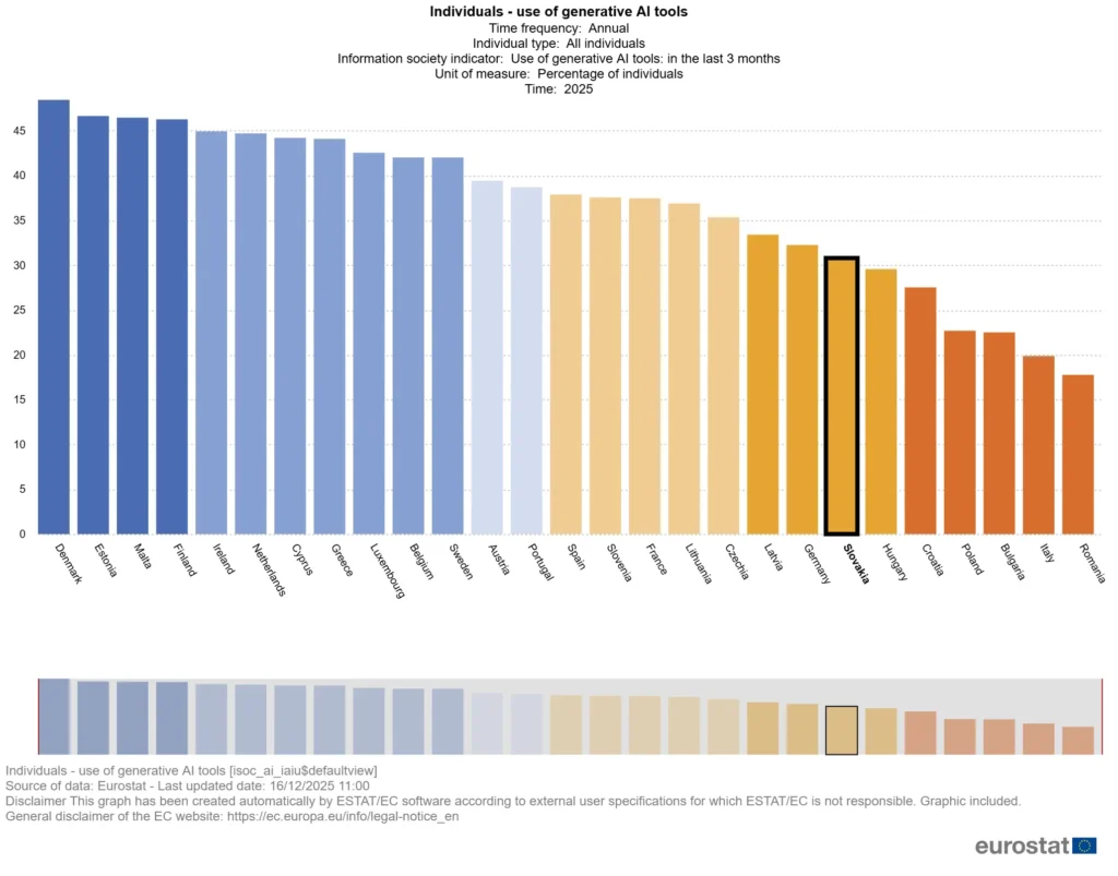 Aj podľa údajov Eurostatu pre rok 2025 je Slovensko, čo sa týka intenzity využívania AI ekonomicky aktívnou populáciou, v poslednej tretine rebríčka (21. miesto z 27 krajín EÚ, obr. 3).
