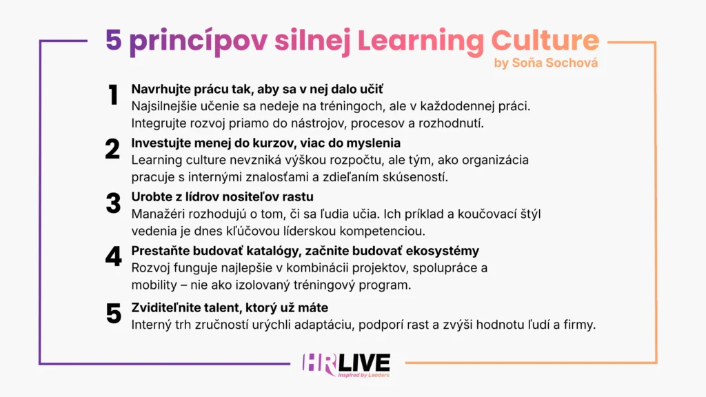 Podľa LinkedIn Workplace Learning Report 2025 sa až 91 % odborníkov na vzdelávanie zhoduje, že kontinuálne učenie je dnes pre kariérny úspech dôležitejšie než kedykoľvek predtým. Learning culture (učiaca sa kultúra, pozn.red.) sa tak prestáva týkať len HR a čoraz viac sa stáva témou CEO, členov boardov a strategických diskusií o budúcnosti organizácií.